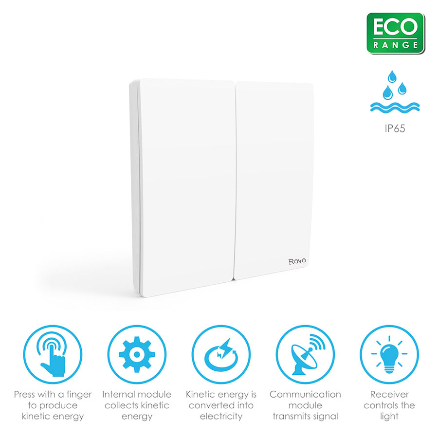 Intrerupatorul Kinetic Rovo nu are nevoie de baterii, fire sau alimentare. Poate controla pana la 100 de metri(in exterior) si 30 de