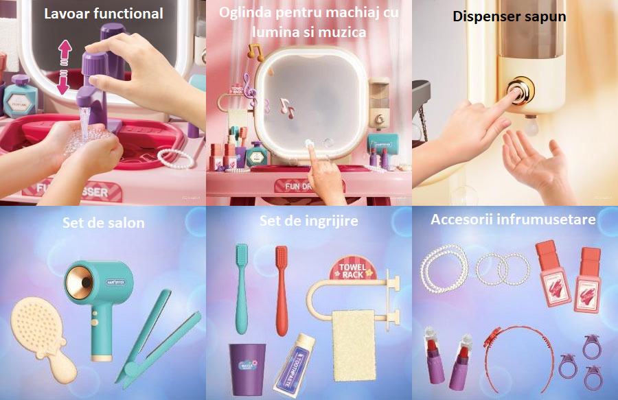 Masuta de Machiaj jucarie Rovo 959 - Acest set de toaleta pentru copii include o masuta de toaleta pentru fetite cu oglinda, lumini si muzica, un dozator functional pentru sapunuri, robinet cu senzor, un uscator de păr functional si multe accesorii.