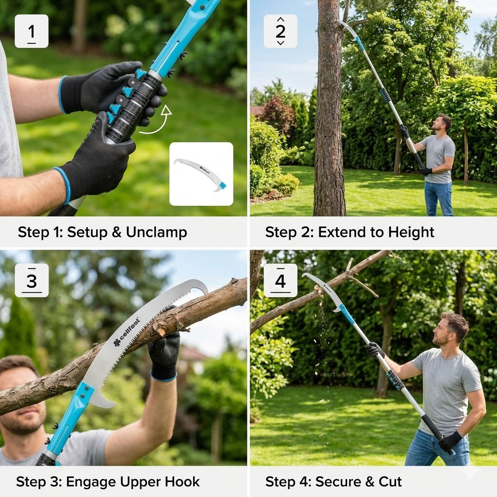 Fierastrau de gradina extensibil Cellfast CELLPRO, 5.5 m Destinat taierii crengilor verzi si uscateForma lamei din otel calit asigura o taiere usoara a crengilor de diferite grosimi Dintii fierastraului profilati in trei planuri permit o taiere sigura si rapida, reducand totodata blocarea (infundarea) lamei Capatul in forma de carlig previne alunecarea fierastraului in timpul lucrului si faciliteaza taierea precisa Dotat cu maner din aluminiu cu lungime reglabila intre 186-550 cm