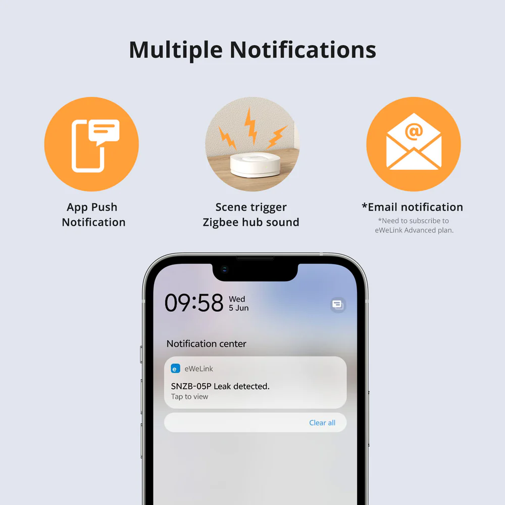 SONOFF SNZB-05P ofera o varietate de notificari, inclusiv: aplicatia eWeLink (notificari push), o alarma sonora prin intermediul unui gateway ZigBee sau notificari prin e-mail (cu un abonament eWeLink Advanced).